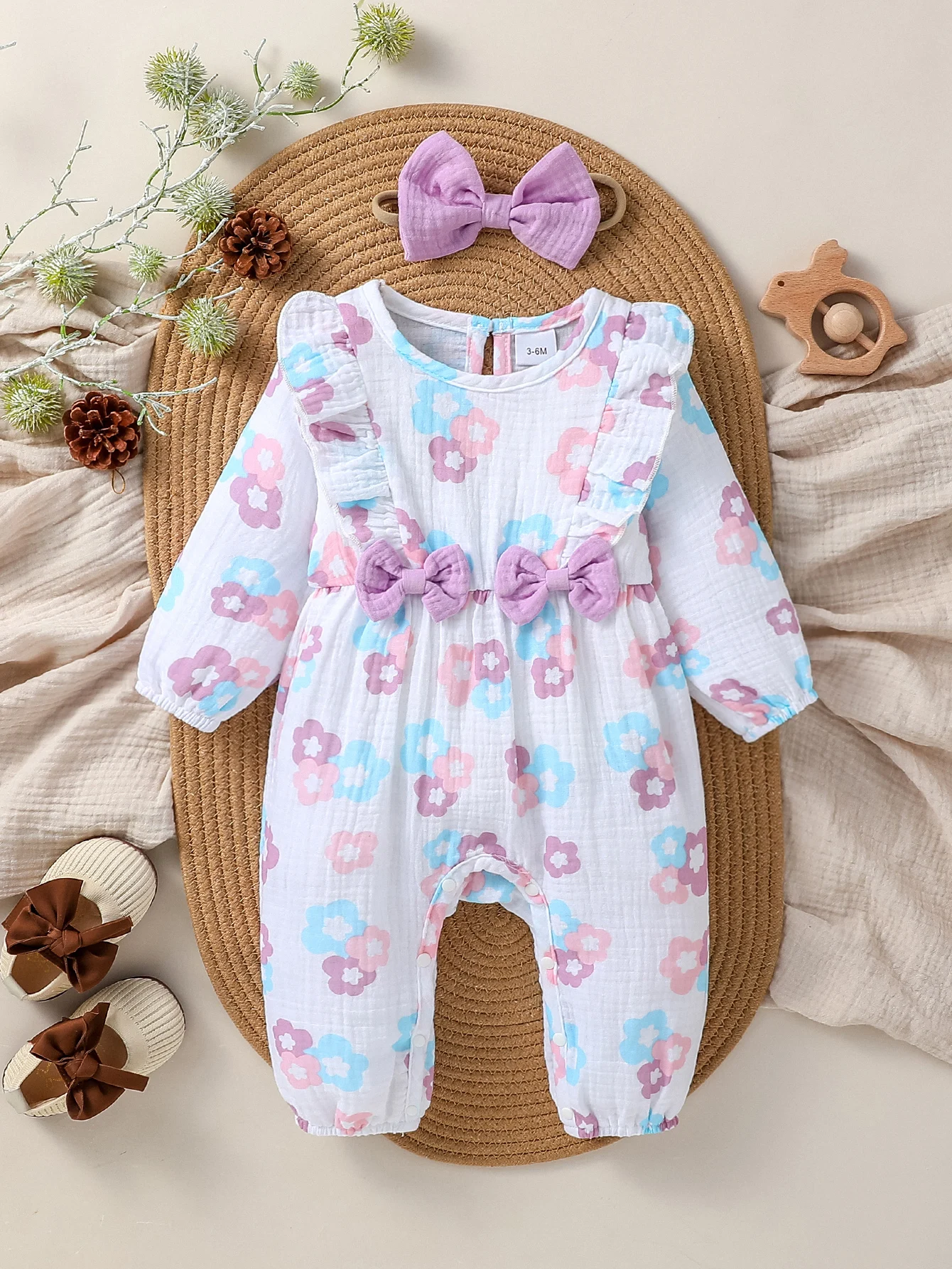 Baby Girls Cotton Soft Spring/Fall Long Sleeve Print Floral With Bow Jumpsuit Honey Cute Clothes +Headband