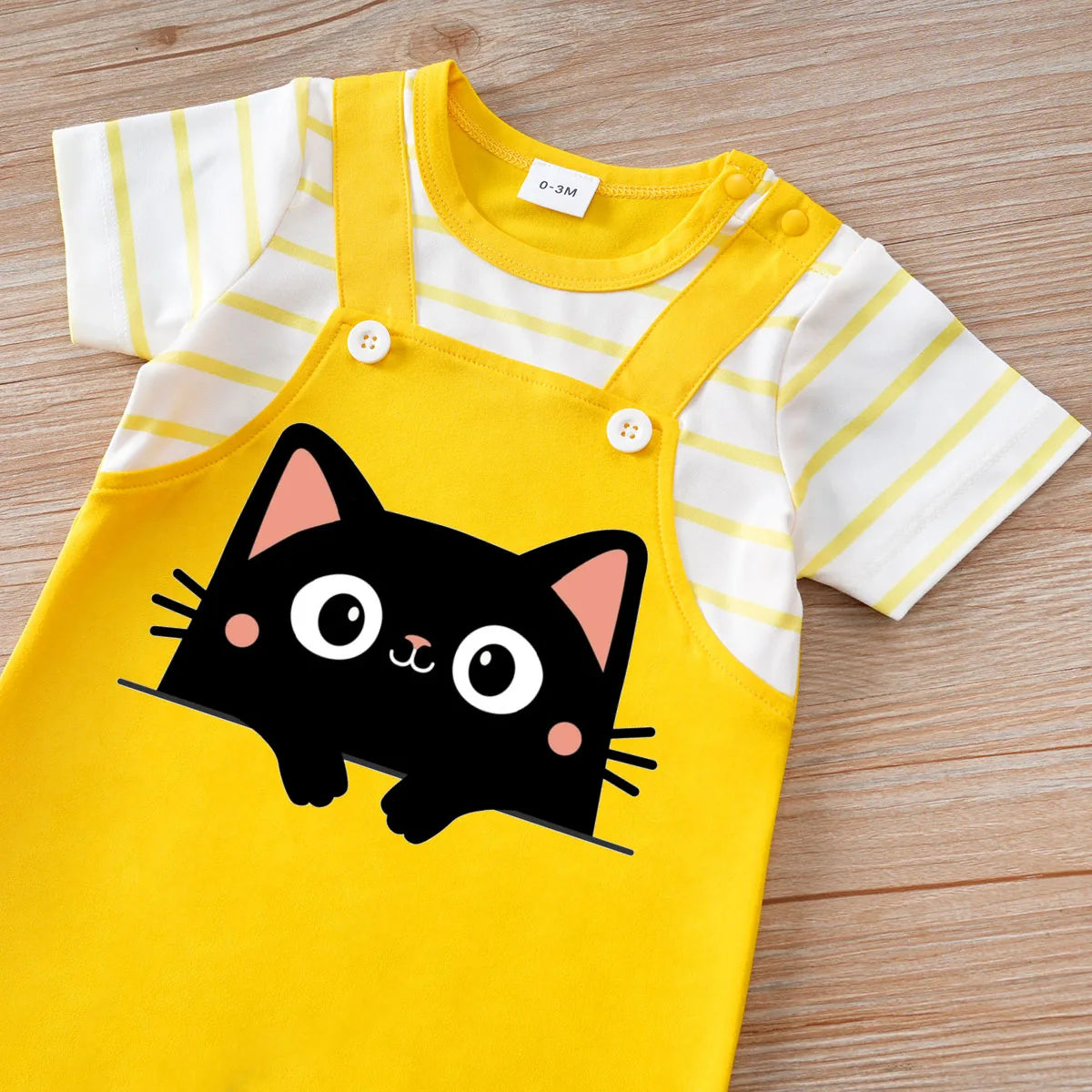 IURNXB Newborn Baby Romper Summer Cat Printed Short Sleeve Stripe Jumpsuit Infant One Piece Outfit for Boys Girls Unisex 0-18M