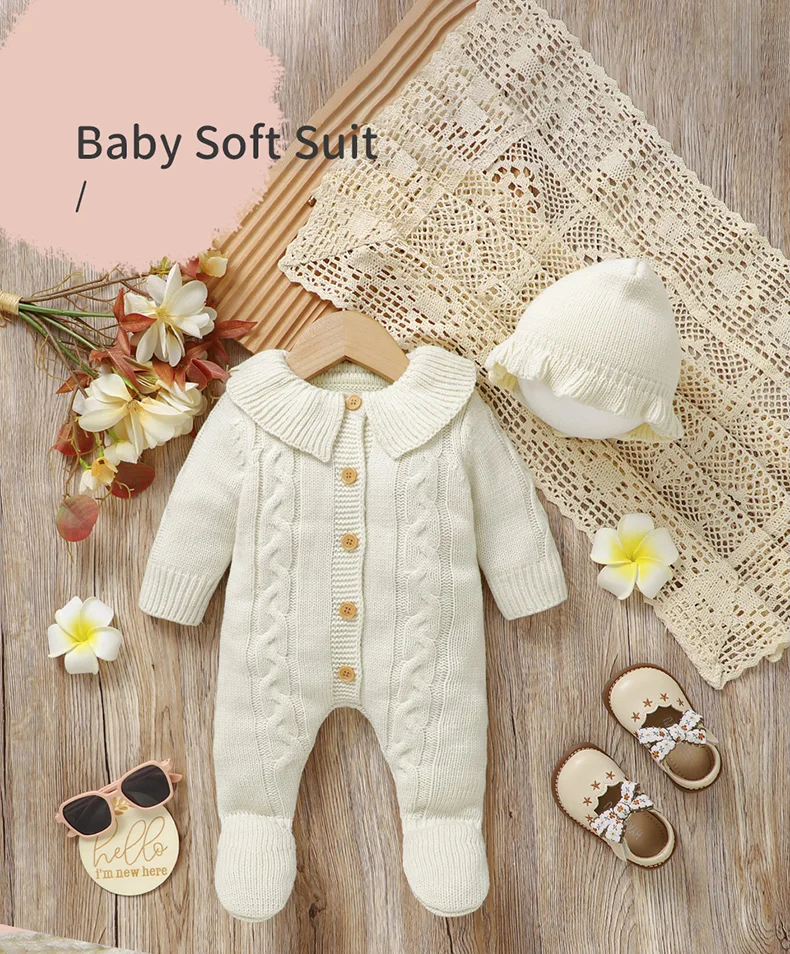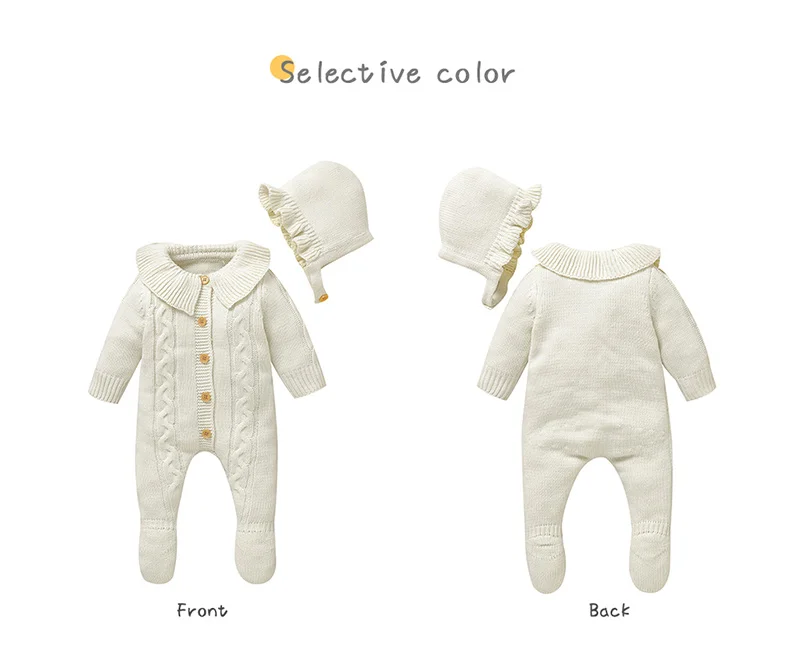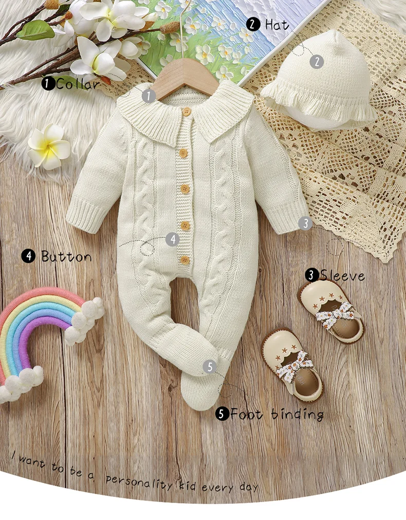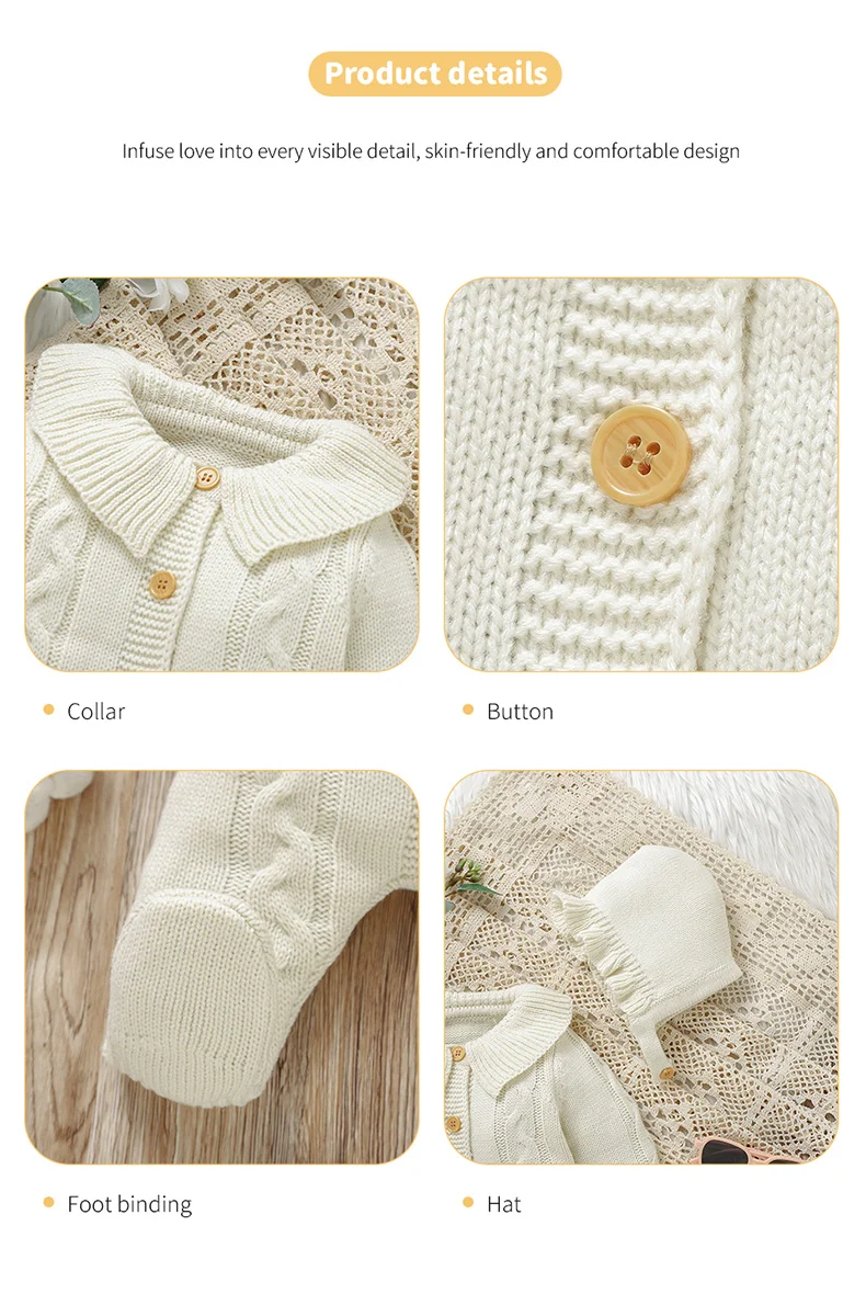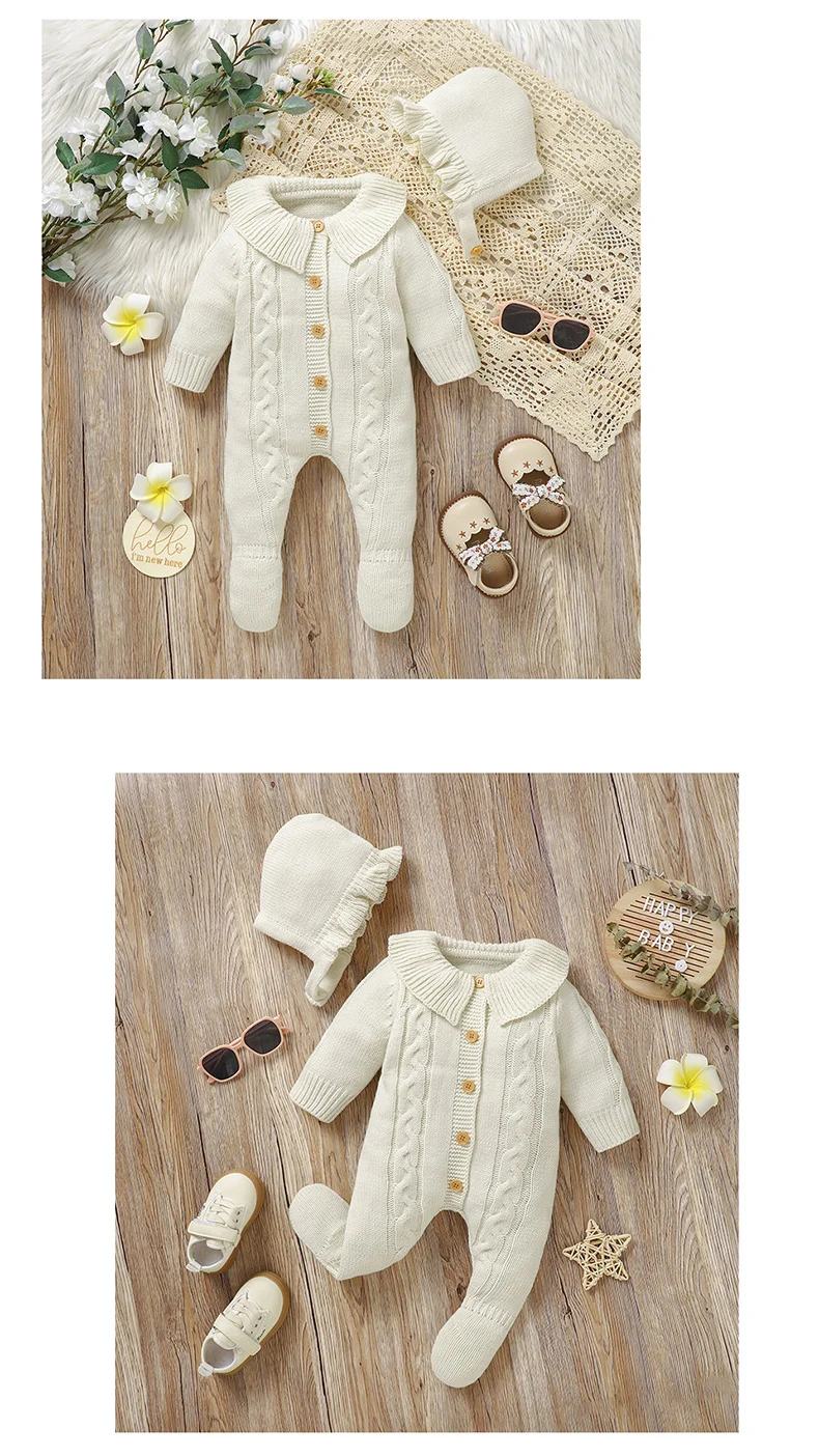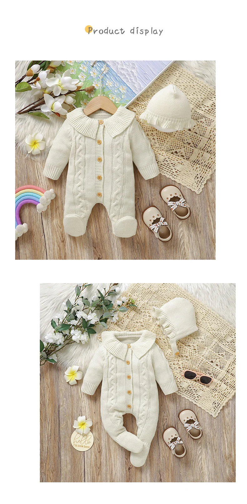 Newborn Baby Romper Knitted Infant Boy Girl Jumpsuit Outfits Long Sleeve Autumn Kid Clothes Hat 2PCS 0-9M Overalls Fashion Solid