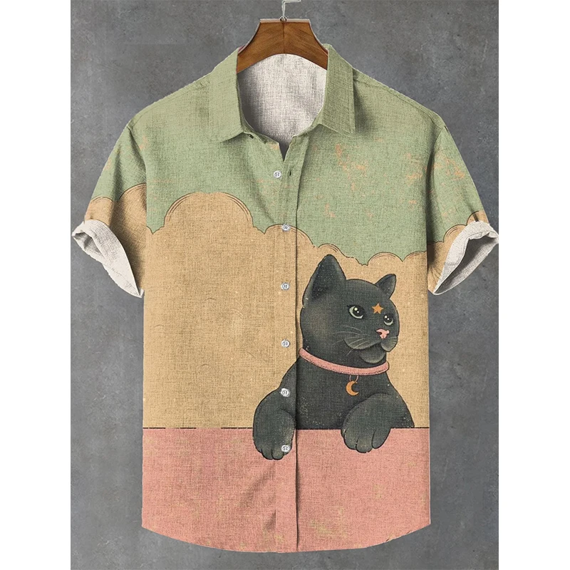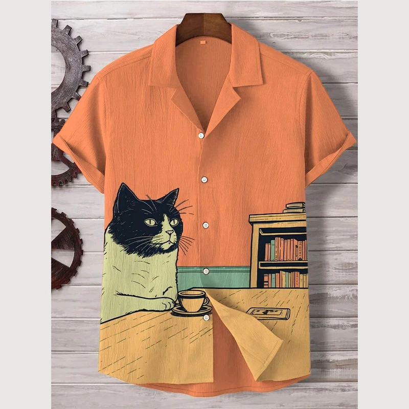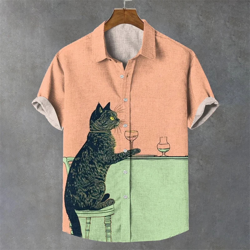 Summer Men's Shirt Animal Graphic Print Cat Shirts Casual Short Sleeve Streetwear Fashion Male Oversized Clothing Funny Blouse